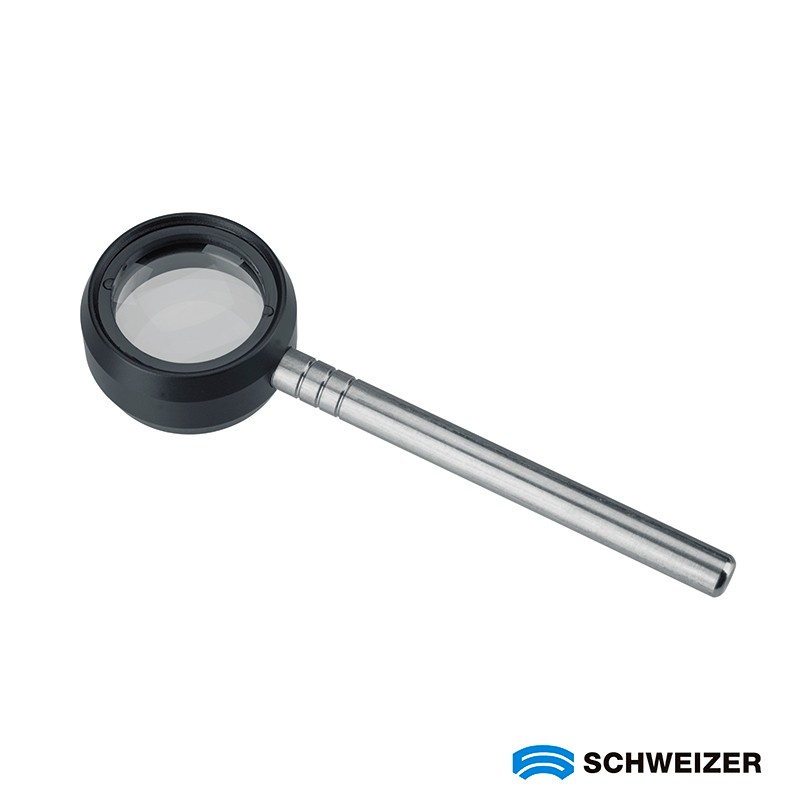 Lupa técnica 10x con lente aplanática y mango de metal de la marca alemana Schweizer.